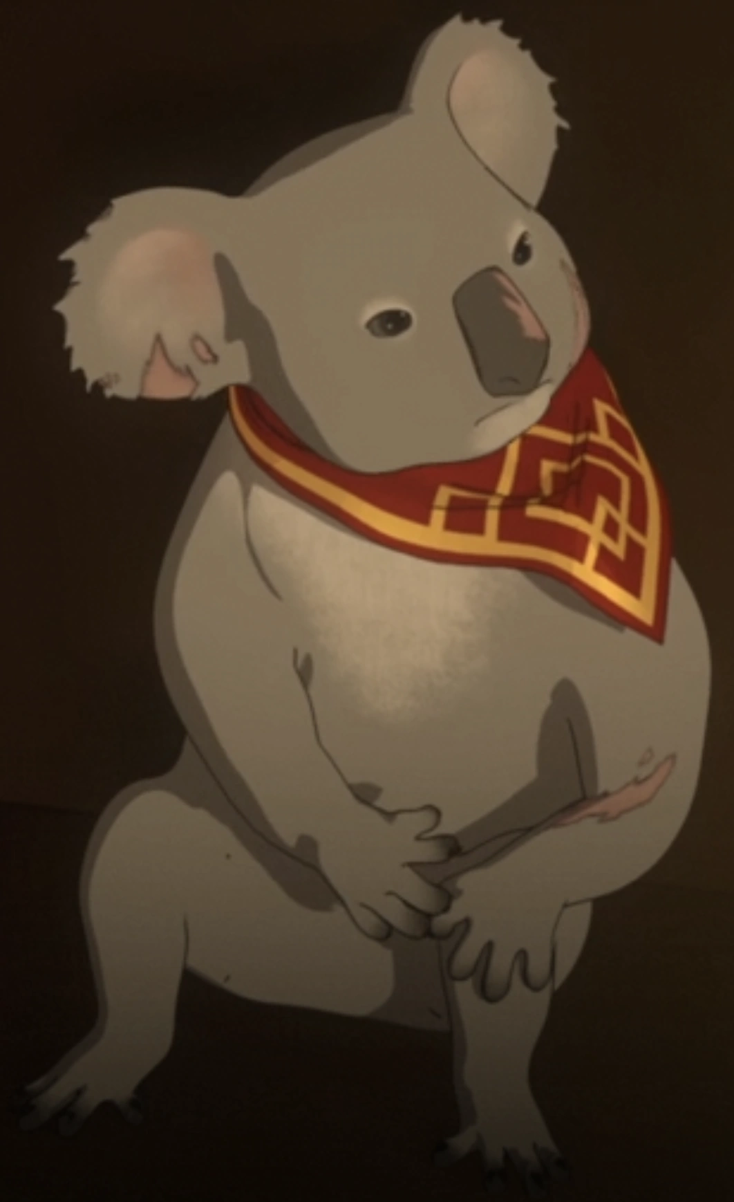 Mr. Cook is roughly an average koala but with a sporadic presence of scars on his face, left arm, and right ear. He wears a crimson neckerchief outlined with gold pattern.